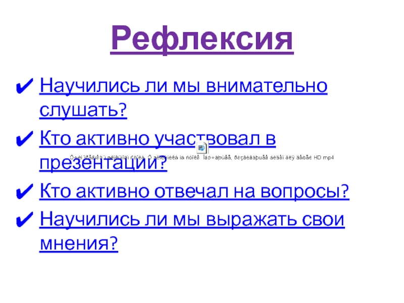 РефлексияНаучились ли мы внимательно слушать?Кто активно участвовал в презентации?Кто активно отвечал на вопросы?Научились ли мы выражать свои