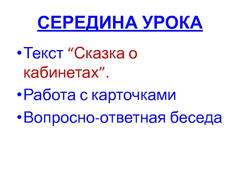 СЕРЕДИНА УРОКАТекст “Сказка о кабинетах”.Работа с карточкамиВопросно-ответная беседа