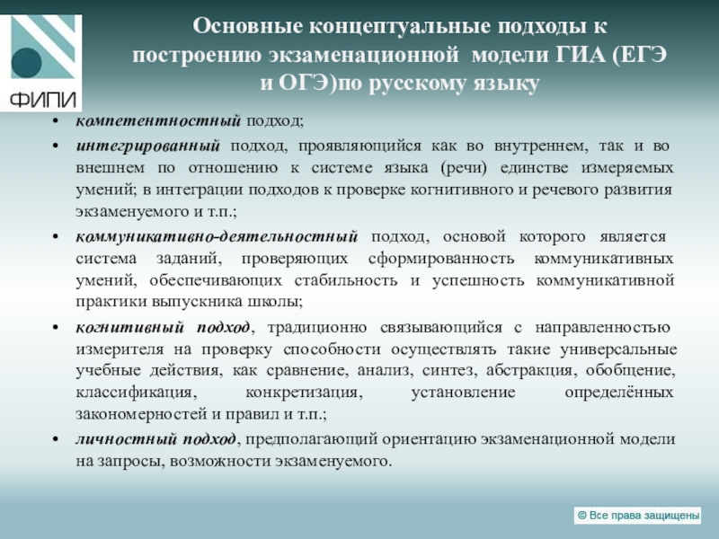 интегрированный подход, проявляющийся как во внутреннем, так и во внешнем по отношению к системе языка (речи) единстве измеряемых умений; в интеграции подходов к проверке когнитивного и речевого развития экзаменуемого и т.п.;