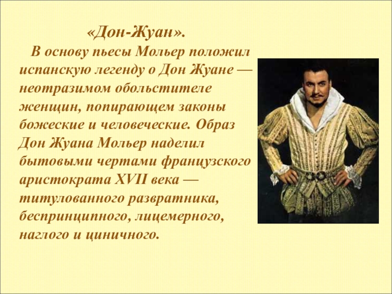 Жуане — неотразимом обольстителе женщин, попирающем законы божеские и человеческие. Образ Дон Жуана Мольер наделил бытовыми чертами французского аристократа XVII века — титулованного развратника,