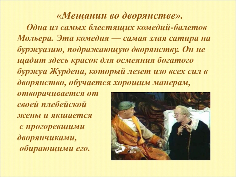 комедия — самая злая сатира на буржуазию, подражающую дворянству. Он не щадит здесь красок для осмеяния богатого буржуа Журдена, который лезет изо всех сил в дворянство, обучается хорошим манерам,