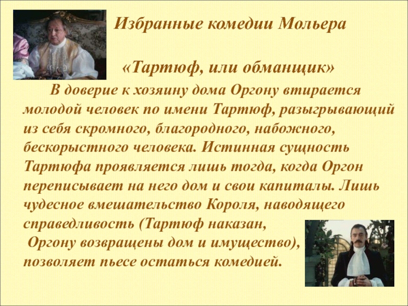 В доверие к хозяину дома Оргону втирается молодой человек по имени Тартюф, разыгрывающий из себя скромного, благородного, набожного, бескорыстного человека. Истинная сущность Тартюфа проявляется лишь тогда, когда Оргон переписывает на него дом и свои капиталы. Лишь чудесное вмешательство Короля, наводящего справедливость (Тартюф наказан,