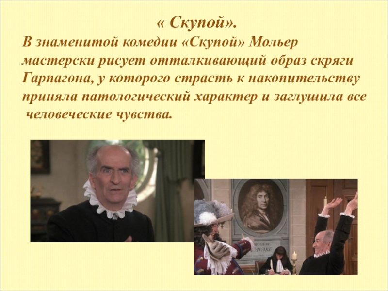 В знаменитой комедии «Скупой» Мольер мастерски рисует отталкивающий образ скряги