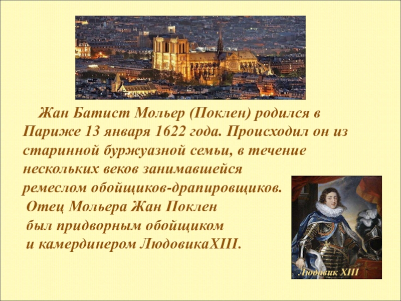 Слайд 3 Жан Батист Мольер (Поклен) родился в Париже 13 января