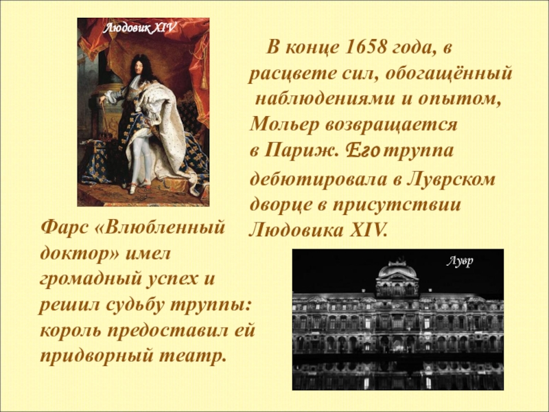 Фарс «Влюбленный доктор» имел громадный успех и решил судьбу труппы: король предоставил ей придворный театр.