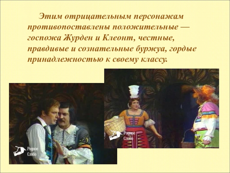 Слайд 18 Этим отрицательным персонажам противопоставлены положительные — госпожа Журден