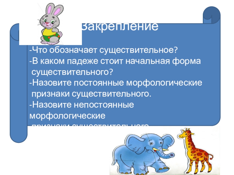 Закрепление-Что обозначает существительное?-В каком падеже стоит начальная форма  существительного?-Назовите постоянные морфологические  признаки существительного.-Назовите непостоянные морфологические