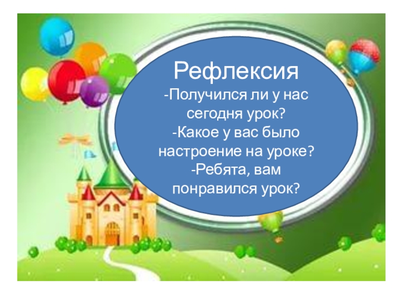 Рефлексия-Получился ли у нас сегодня урок?-Какое у вас было настроение на уроке?-Ребята, вам понравился урок?