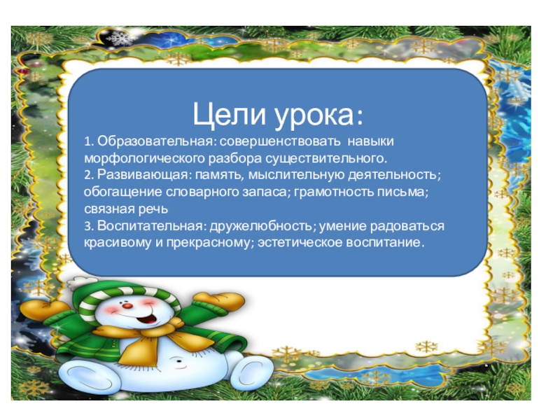 Цели урока:1. Образовательная: совершенствовать навыки морфологического разбора существительного.2. Развивающая: память, мыслительную деятельность; обогащение словарного запаса; грамотность письма; связная речь3. Воспитательная: дружелюбность; умение радоваться красивому и прекрасному; эстетическое воспитание.