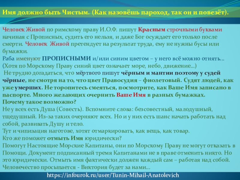 Живой по римскому праву И.О.Ф. пишут Красным строчными буквами начиная с Прописных, судить его нельзя, и даже Бог осуждает его только после смерти. Человек Живой претендует на результат труда, ему не нужны бусы или бумажки.