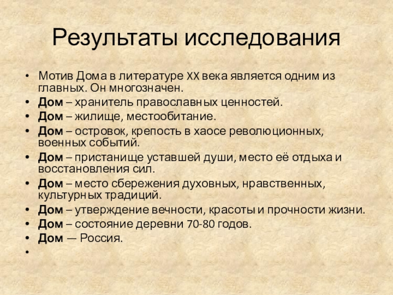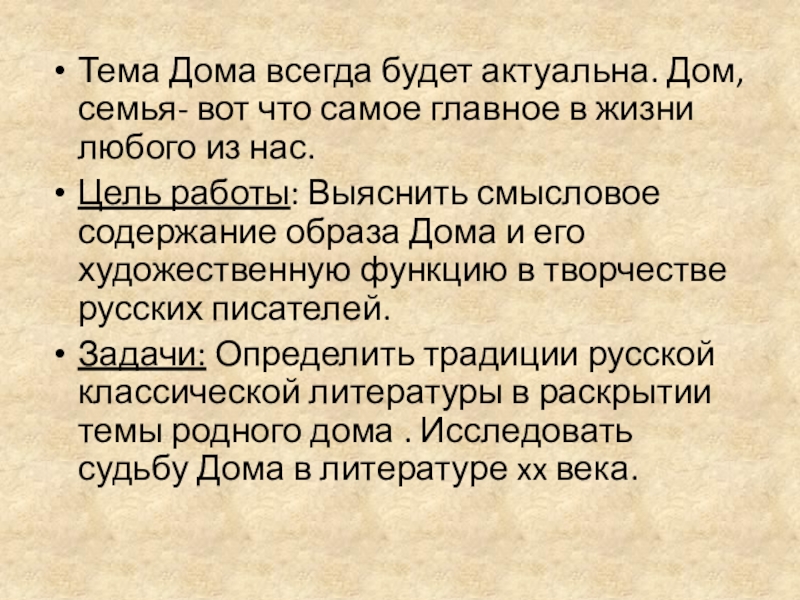 Цель работы: Выяснить смысловое содержание образа Дома и его художественную функцию в творчестве русских писателей.