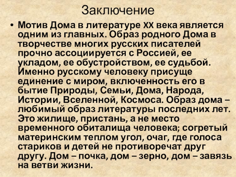 родного Дома в творчестве многих русских писателей прочно ассоциируется с Россией, ее укладом, ее обустройством, ее судьбой. Именно русскому человеку присуще единение с миром, включенность его в бытие Природы, Семьи, Дома, Народа, Истории, Вселенной, Космоса. Образ дома – любимый образ литературы последних лет. Это жилище, пристань, а не место временного обиталища человека; согретый материнским теплом угол, очаг, где голоса стариков и детей не противоречат друг другу. Дом – почка, дом – зерно, дом – завязь на ветви жизни.