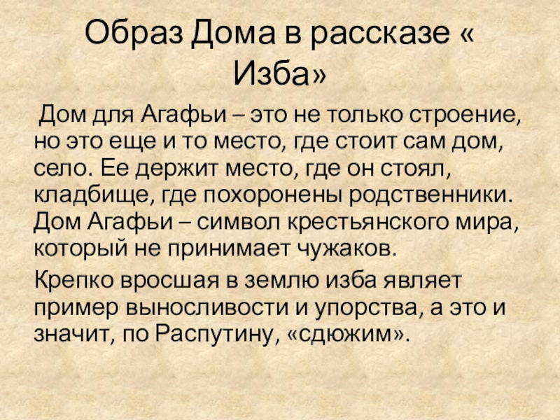 не только строение, но это еще и то место, где стоит сам дом, село. Ее держит место, где он стоял, кладбище, где похоронены родственники. Дом Агафьи – символ крестьянского мира, который не принимает чужаков.