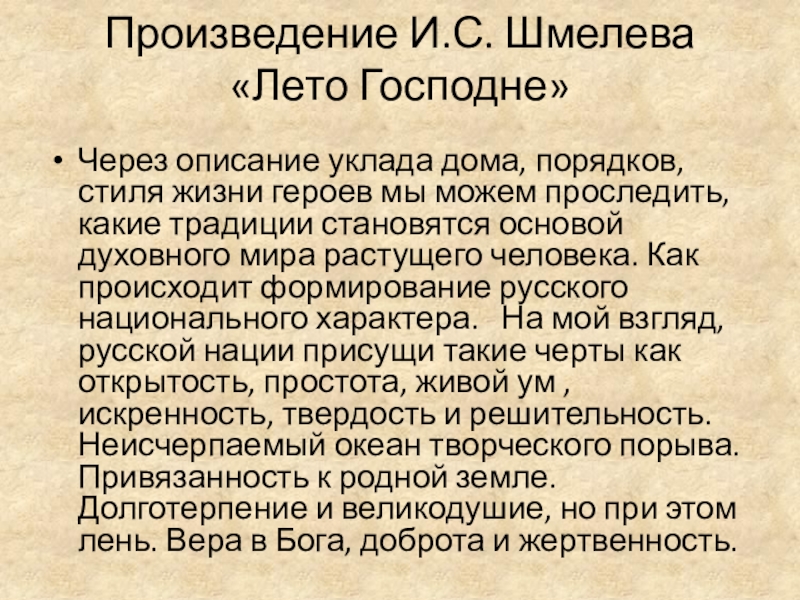 героев мы можем проследить, какие традиции становятся основой духовного мира растущего человека. Как происходит формирование русского национального характера. На мой взгляд, русской нации присущи такие черты как открытость, простота, живой ум , искренность, твердость и решительность. Неисчерпаемый океан творческого порыва. Привязанность к родной земле. Долготерпение и великодушие, но при этом лень. Вера в Бога, доброта и жертвенность.