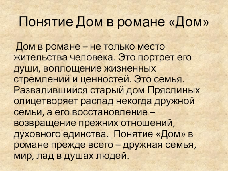 место жительства человека. Это портрет его души, воплощение жизненных стремлений и ценностей. Это семья. Развалившийся старый дом Пряслиных олицетворяет распад некогда дружной семьи, а его восстановление – возвращение прежних отношений, духовного единства. Понятие «Дом» в романе прежде всего – дружная семья, мир, лад в душах людей.