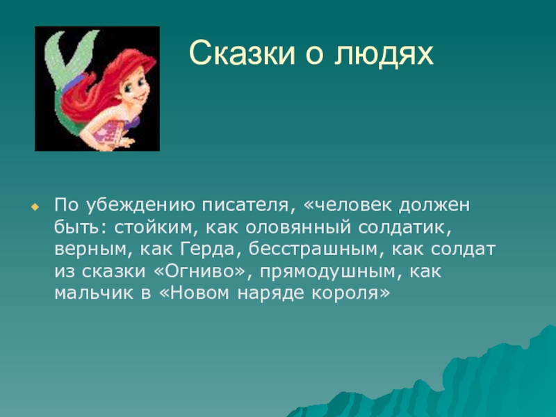 стойким, как оловянный солдатик, верным, как Герда, бесстрашным, как солдат из сказки «Огниво», прямодушным, как мальчик в «Новом наряде короля»