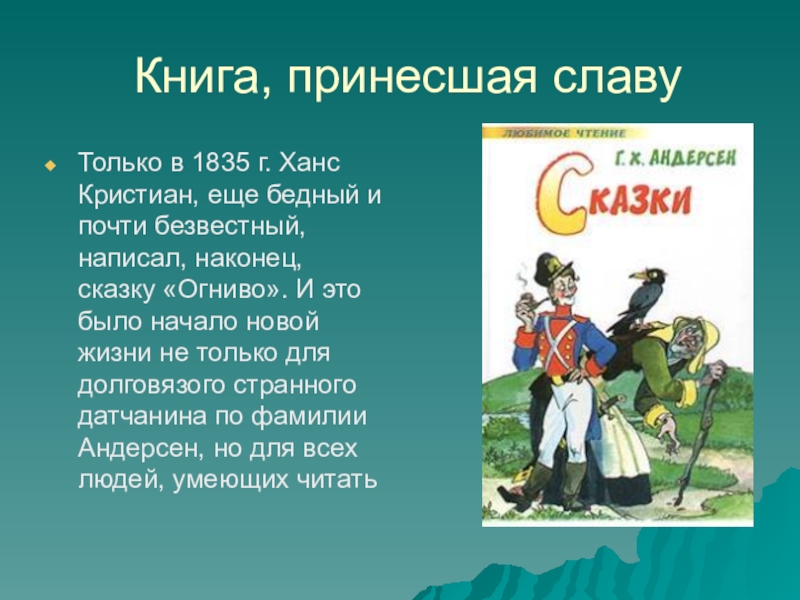почти безвестный, написал, наконец, сказку «Огниво». И это было начало новой жизни не только для долговязого странного датчанина по фамилии Андерсен, но для всех людей, умеющих читать