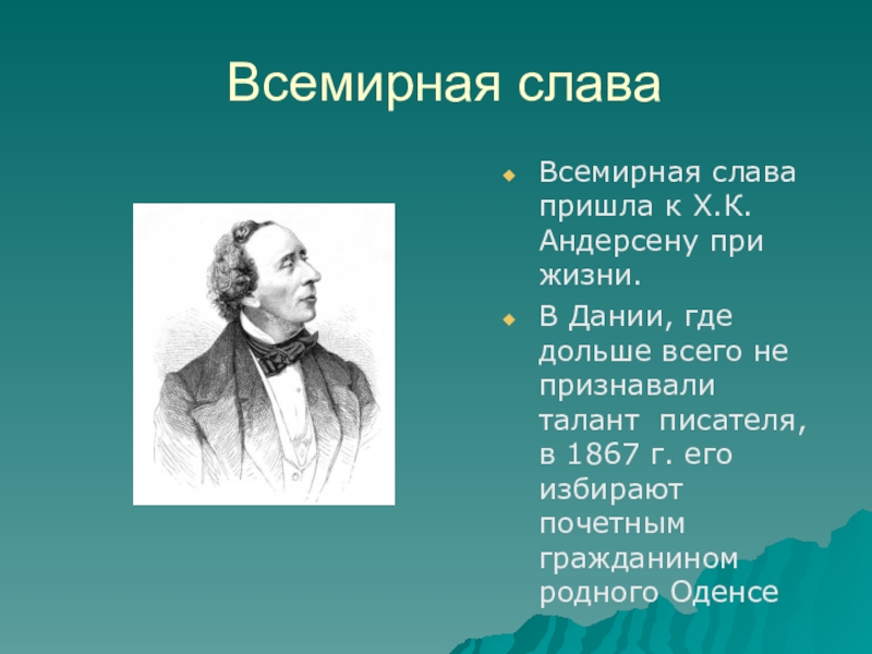 Всемирная слава пришла к Х.К. Андерсену при жизни.