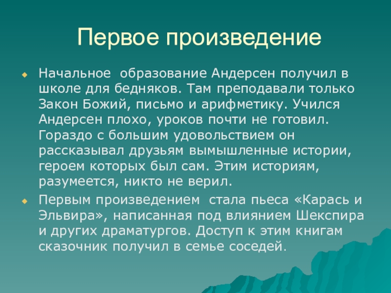 Первым произведением стала пьеса «Карась и Эльвира», написанная под влиянием Шекспира и других драматургов. Доступ к этим книгам сказочник получил в семье соседей.