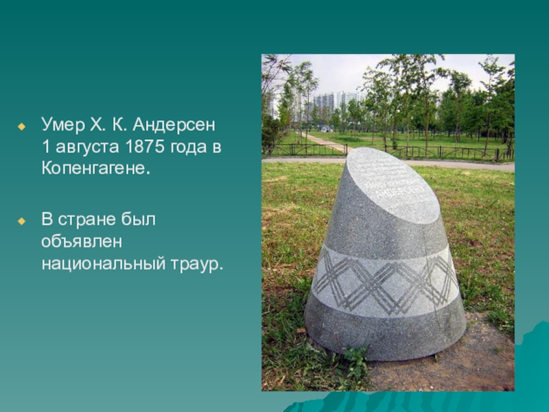 Слайд 14Умер Х. К. Андерсен 1 августа 1875 года в Копенгагене.