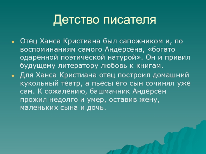 Отец Ханса Кристиана был сапожником и, по воспоминаниям самого Андерсена,
