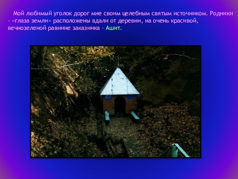 Слайд 14 Мой любимый уголок дорог мне своим целебным святым источником.
