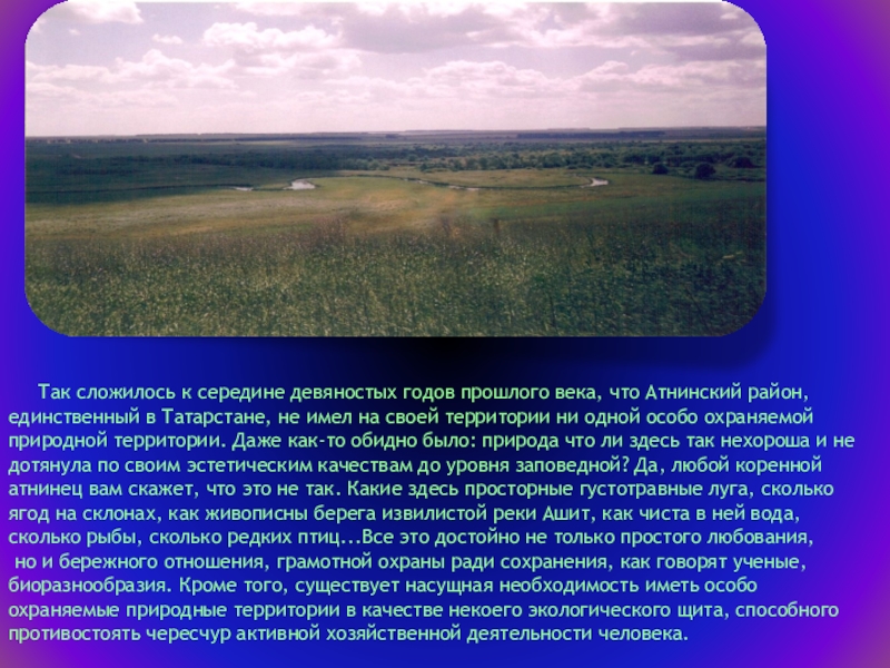 что Атнинский район, единственный в Татарстане, не имел на своей территории ни одной особо охраняемой природной территории. Даже как-то обидно было: природа что ли здесь так нехороша и не дотянула по своим эстетическим качествам до уровня заповедной? Да, любой коренной атнинец вам скажет, что это не так. Какие здесь просторные густотравные луга, сколько ягод на склонах, как живописны берега извилистой реки Ашит, как чиста в ней вода, сколько рыбы, сколько редких птиц...Все это достойно не только простого любования,