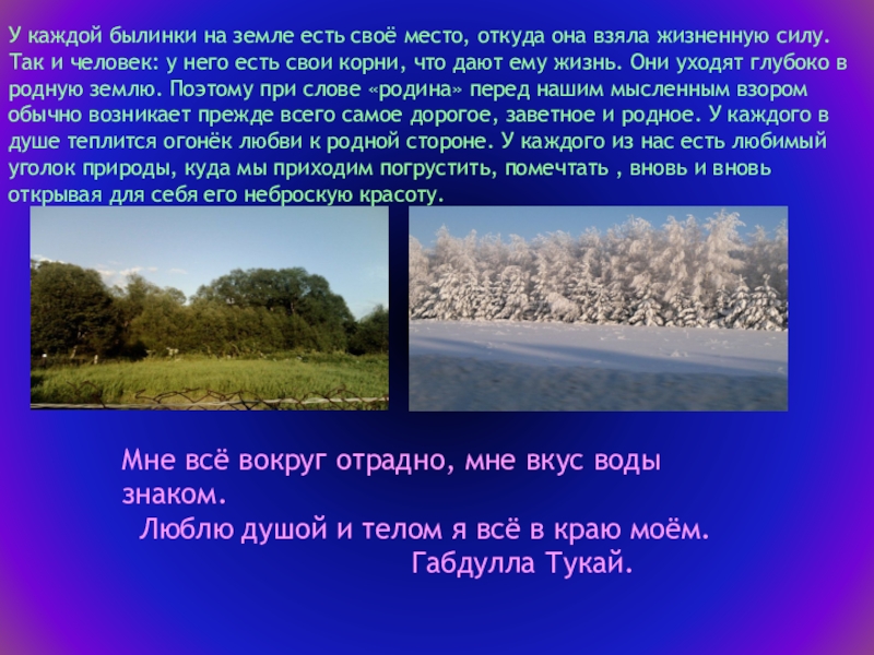 жизненную силу. Так и человек: у него есть свои корни, что дают ему жизнь. Они уходят глубоко в родную землю. Поэтому при слове «родина» перед нашим мысленным взором обычно возникает прежде всего самое дорогое, заветное и родное. У каждого в душе теплится огонёк любви к родной стороне. У каждого из нас есть любимый уголок природы, куда мы приходим погрустить, помечтать , вновь и вновь открывая для себя его неброскую красоту.
