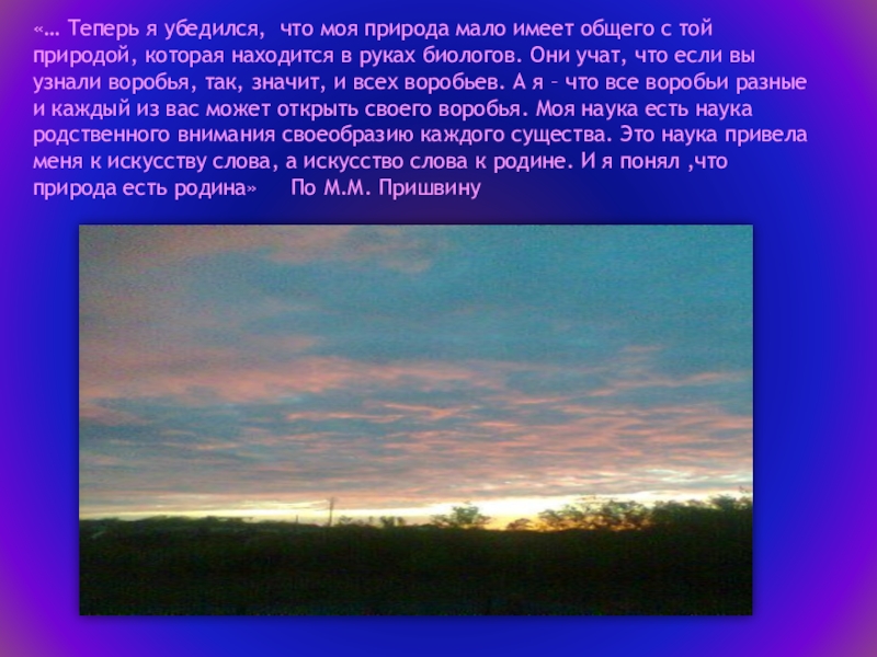 той природой, которая находится в руках биологов. Они учат, что если вы узнали воробья, так, значит, и всех воробьев. А я – что все воробьи разные и каждый из вас может открыть своего воробья. Моя наука есть наука родственного внимания своеобразию каждого существа. Это наука привела меня к искусству слова, а искусство слова к родине. И я понял ,что природа есть родина» По М.М. Пришвину