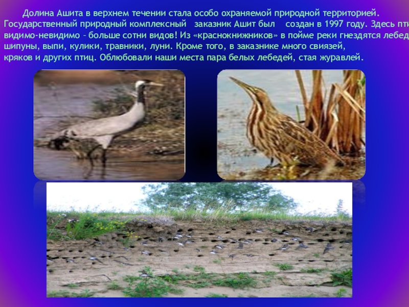 охраняемой природной территорией. Государственный природный комплексный заказник Ашит был создан в 1997 году. Здесь птиц видимо-невидимо – больше сотни видов! Из «краснокнижников» в пойме реки гнездятся лебеди-шипуны, выпи, кулики, травники, луни. Кроме того, в заказнике много свиязей,