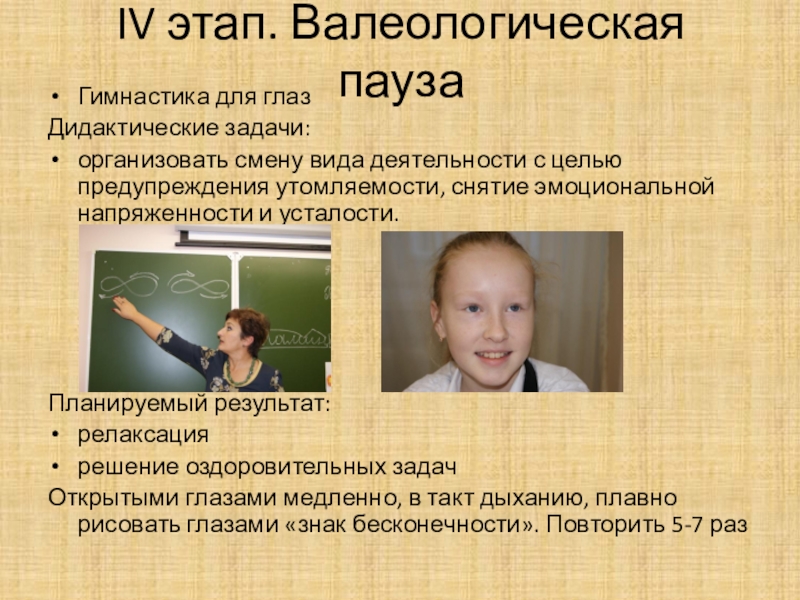Открытыми глазами медленно, в такт дыханию, плавно рисовать глазами «знак бесконечности». Повторить 5-7 раз
