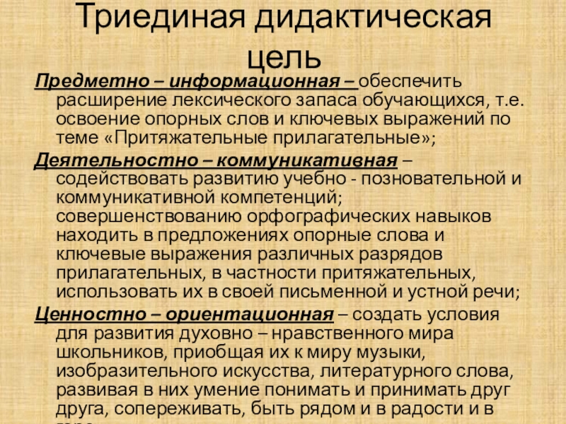 Деятельностно – коммуникативная – содействовать развитию учебно - позновательной и коммуникативной компетенций; совершенствованию орфографических навыков находить в предложениях опорные слова и ключевые выражения различных разрядов прилагательных, в частности притяжательных, использовать их в своей письменной и устной речи;