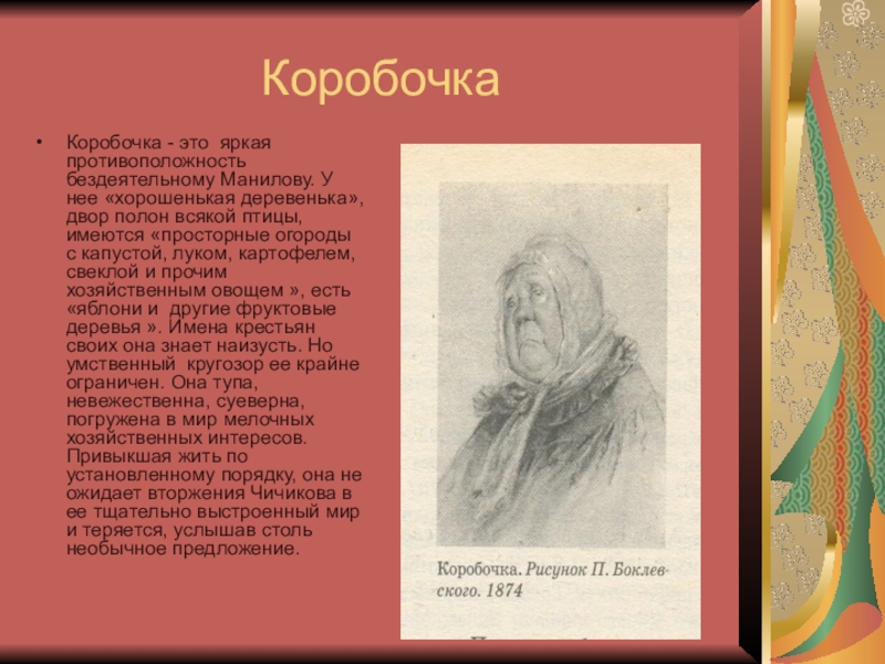 это яркая противоположность бездеятельному Манилову. У нее «хорошенькая деревенька», двор полон всякой птицы, имеются «просторные огороды с капустой, луком, картофелем, свеклой и прочим хозяйственным овощем », есть «яблони и другие фруктовые деревья ». Имена крестьян своих она знает наизусть. Но умственный кругозор ее крайне ограничен. Она тупа, невежественна, суеверна, погружена в мир мелочных хозяйственных интересов. Привыкшая жить по установленному порядку, она не ожидает вторжения Чичикова в ее тщательно выстроенный мир и теряется, услышав столь необычное предложение.