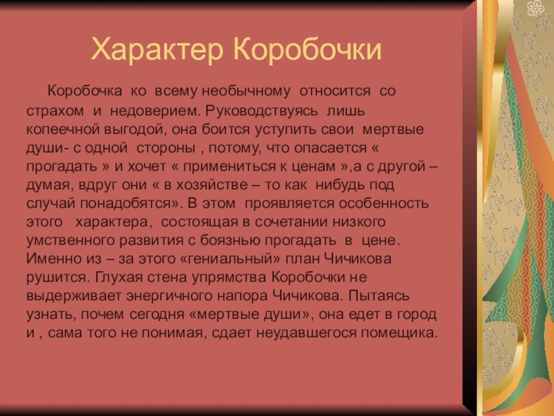 ко всему необычному относится со страхом и недоверием. Руководствуясь лишь копеечной выгодой, она боится уступить свои мертвые души- с одной стороны , потому, что опасается « прогадать » и хочет « примениться к ценам »,а с другой – думая, вдруг они « в хозяйстве – то как нибудь под случай понадобятся». В этом проявляется особенность этого характера, состоящая в сочетании низкого умственного развития с боязнью прогадать в цене. Именно из – за этого «гениальный» план Чичикова рушится. Глухая стена упрямства Коробочки не выдерживает энергичного напора Чичикова. Пытаясь узнать, почем сегодня «мертвые души», она едет в город и , сама того не понимая, сдает неудавшегося помещика.