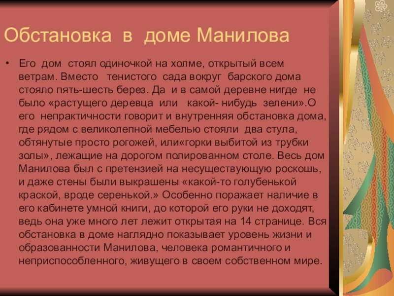 ветрам. Вместо тенистого сада вокруг барского дома стояло пять-шесть берез. Да и в самой деревне нигде не было «растущего деревца или какой- нибудь зелени».О его непрактичности говорит и внутренняя обстановка дома, где рядом с великолепной мебелью стояли два стула, обтянутые просто рогожей, или«горки выбитой из трубки золы», лежащие на дорогом полированном столе. Весь дом Манилова был с претензией на несуществующую роскошь, и даже стены были выкрашены «какой-то голубенькой краской, вроде серенькой.» Особенно поражает наличие в его кабинете умной книги, до которой его руки не доходят, ведь она уже много лет лежит открытая на 14 странице. Вся обстановка в доме наглядно показывает уровень жизни и образованности Манилова, человека романтичного и неприспособленного, живущего в своем собственном мире.