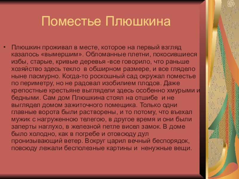 на первый взгляд казалось «вымершим». Обломанные плетни, покосившиеся избы, старые, кривые деревья -все говорило, что раньше хозяйство здесь текло в обширном размере, и все глядело ныне пасмурно. Когда-то роскошный сад окружал поместье по периметру, но не радовал изобилием плодов. Даже крепостные крестьяне выглядели здесь особенно хмурыми и бедными. Сам дом Плюшкина стоял на отшибе и не выглядел домом зажиточного помещика. Только одни главные ворота были растворены, и то потому, что въехал мужик с нагруженною телегою, в другое время и они были заперты наглухо, в железной петле висел замок. В доме было холодно, как в погребе и отовсюду дул пронизывающий ветер. Вокруг царил вечный беспорядок, повсюду лежали бесполезные картины и ненужные вещи.