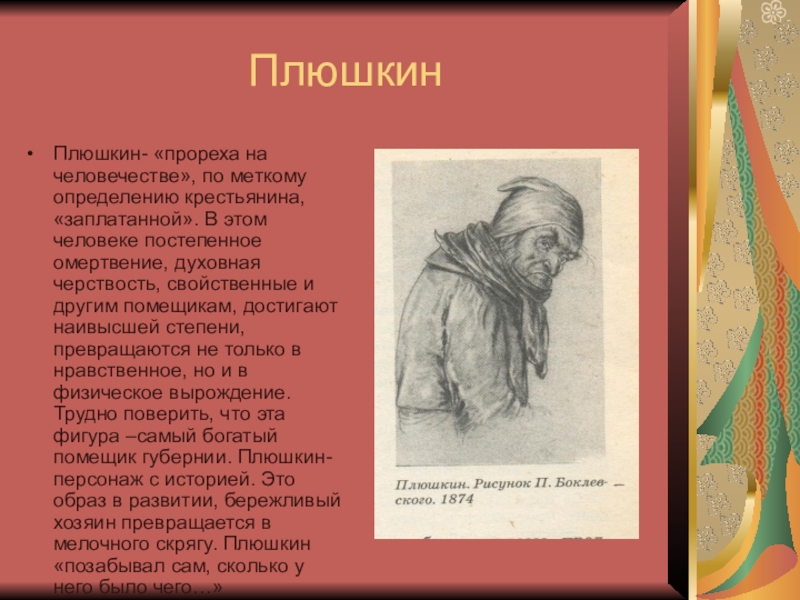 на человечестве», по меткому определению крестьянина, «заплатанной». В этом человеке постепенное омертвение, духовная черствость, свойственные и другим помещикам, достигают наивысшей степени, превращаются не только в нравственное, но и в физическое вырождение. Трудно поверить, что эта фигура –самый богатый помещик губернии. Плюшкин-персонаж с историей. Это образ в развитии, бережливый хозяин превращается в мелочного скрягу. Плюшкин «позабывал сам, сколько у него было чего…»