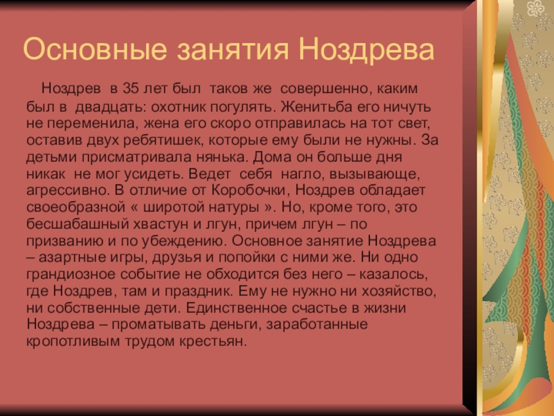 Ноздрев – «вечно молодой», смуглый и обаятельный детина, разбитной и живущий одним днем. Он из тех людей, с которыми с первых минут на «ты».Ноздрев - человек самостоятельный и решительный. Он полная противоположность Манилову и Коробочке – непоседа, герой ярмарок, попоек и карточного стола. Хозяйство его запущено. В отличном состоянии находится только псарня. Среди собак он как « отец родной » среди большого семейства. Доходы, получаемые от подневольного труда крестьян, он тут же проматывает, что говорит о его безразличии к крестьянам.