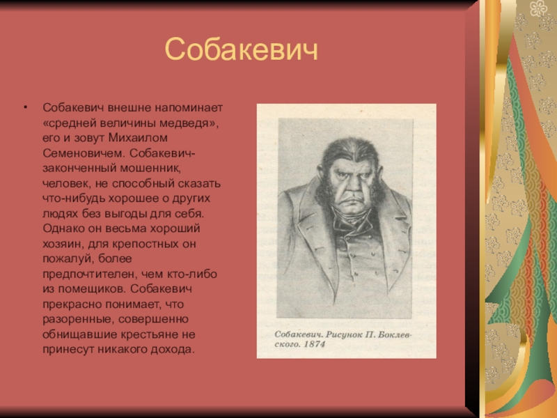 напоминает «средней величины медведя», его и зовут Михаилом Семеновичем. Собакевич- законченный мошенник, человек, не способный сказать что-нибудь хорошее о других людях без выгоды для себя. Однако он весьма хороший хозяин, для крепостных он пожалуй, более предпочтителен, чем кто-либо из помещиков. Собакевич прекрасно понимает, что разоренные, совершенно обнищавшие крестьяне не принесут никакого дохода.