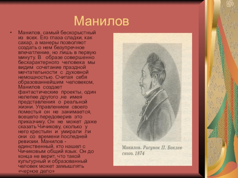 бескорыстный из всех. Его глаза сладки, как сахар, а манеры позволяют создать о нем безупречное впечатление, но лишь в первую минуту. В образе совершенно бесхарактерного человека мы видим сочетание праздной мечтательности с духовной немощностью. Считая себя образованнейшим человеком, Манилов создает фантастические проекты, один нелепее другого ,не имея представления о реальной жизни. Управлением своего поместья он не занимается, всецело передоверив это приказчику. Он не может даже сказать Чичикову, сколько у него крестьян и умирали ли они со времени последней ревизии. Манилов -единственный, кто нашел с Чичиковым общий язык. Он до конца не верит, что такой культурный и образованный человек может замышлять «черное дело»