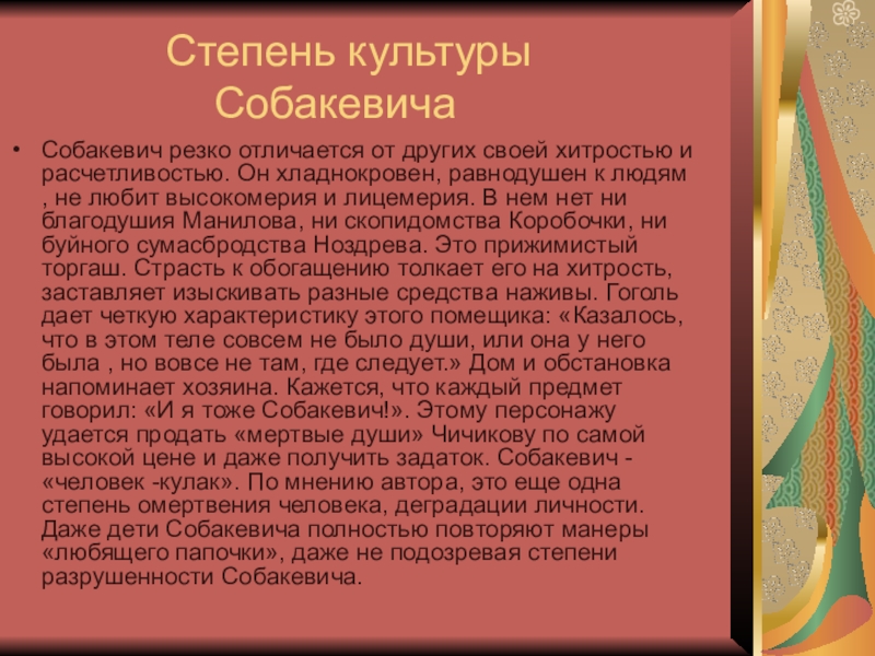 Собакевич резко отличается от других своей хитростью и расчетливостью. Он хладнокровен, равнодушен к людям , не любит высокомерия и лицемерия. В нем нет ни благодушия Манилова, ни скопидомства Коробочки, ни буйного сумасбродства Ноздрева. Это прижимистый торгаш. Страсть к обогащению толкает его на хитрость, заставляет изыскивать разные средства наживы. Гоголь дает четкую характеристику этого помещика: «Казалось, что в этом теле совсем не было души, или она у него была , но вовсе не там, где следует.» Дом и обстановка напоминает хозяина. Кажется, что каждый предмет говорил: «И я тоже Собакевич!». Этому персонажу удается продать «мертвые души» Чичикову по самой высокой цене и даже получить задаток. Собакевич - «человек -кулак». По мнению автора, это еще одна степень омертвения человека, деградации личности. Даже дети Собакевича полностью повторяют манеры «любящего папочки», даже не подозревая степени разрушенности Собакевича.