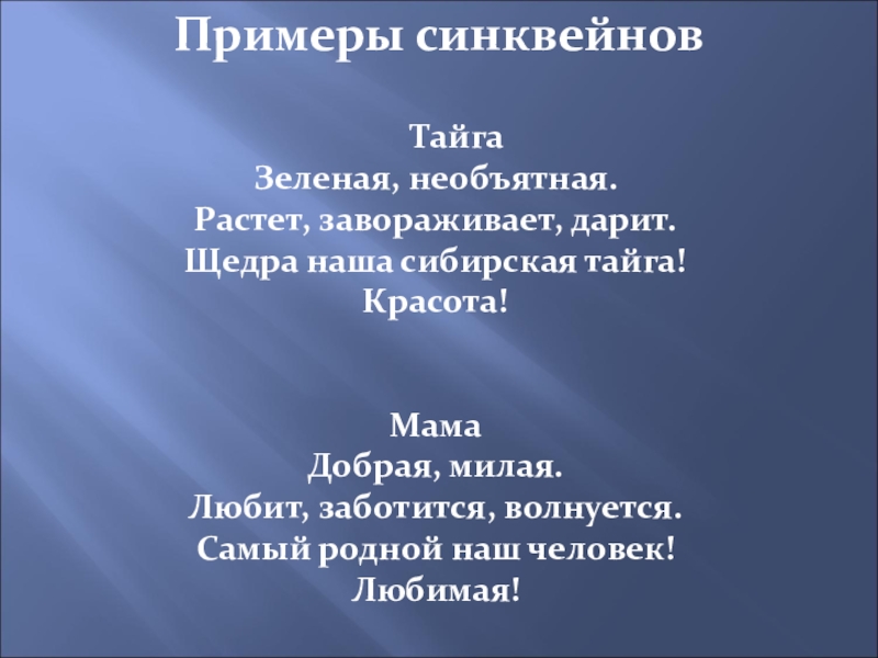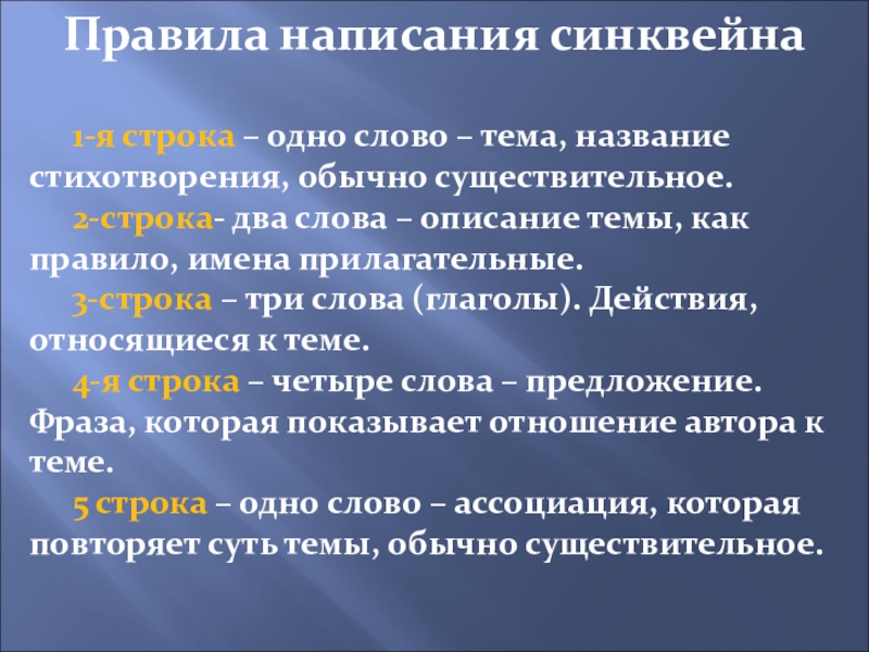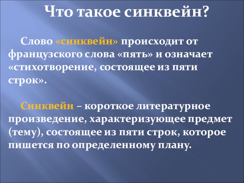 Синквейн – короткое литературное произведение, характеризующее предмет (тему), состоящее из пяти строк, которое пишется по определенному плану.