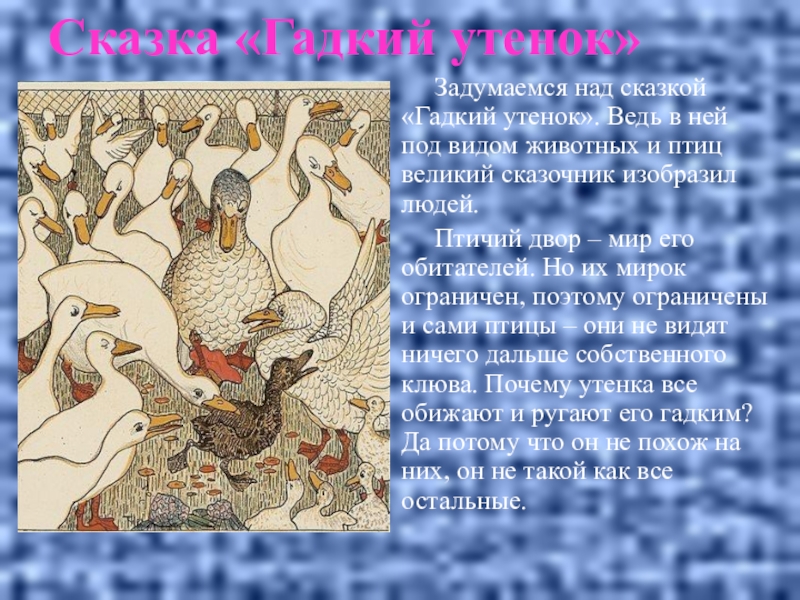 Птичий двор – мир его обитателей. Но их мирок ограничен, поэтому ограничены и сами птицы – они не видят ничего дальше собственного клюва. Почему утенка все обижают и ругают его гадким? Да потому что он не похож на них, он не такой как все остальные.
