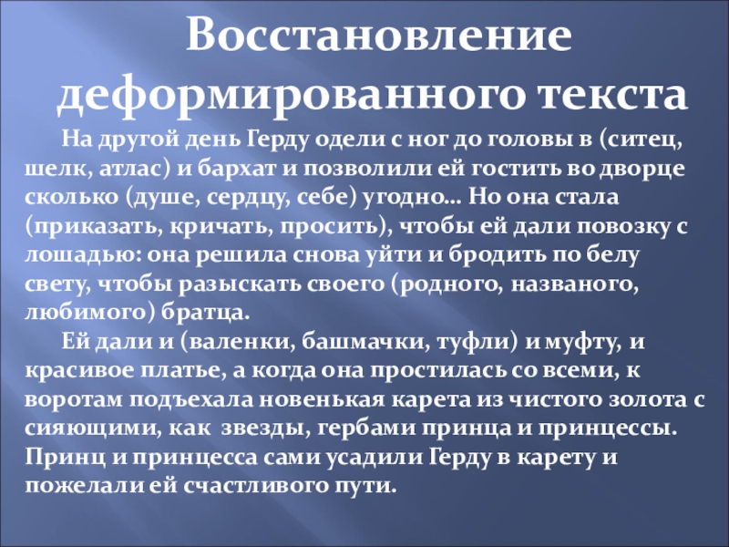 головы в (ситец, шелк, атлас) и бархат и позволили ей гостить во дворце сколько (душе, сердцу, себе) угодно… Но она стала (приказать, кричать, просить), чтобы ей дали повозку с лошадью: она решила снова уйти и бродить по белу свету, чтобы разыскать своего (родного, названого, любимого) братца.