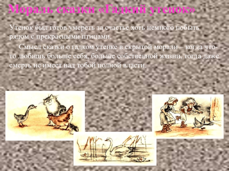 Смысл сказки о гадком утенке в скрытой морали – когда что-то любишь больше себя, больше собственной жизни, тогда даже смерть не имеет над тобой полной власти.