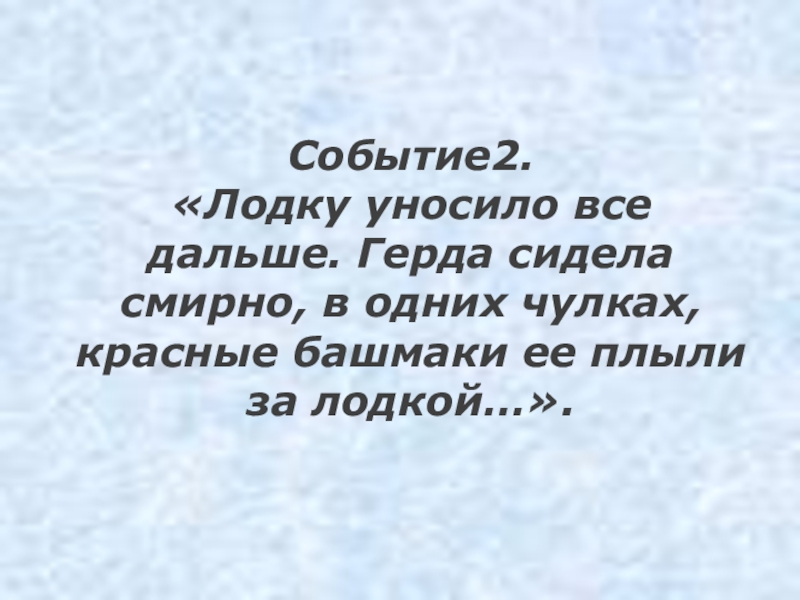 «Лодку уносило все дальше. Герда сидела смирно, в одних чулках, красные