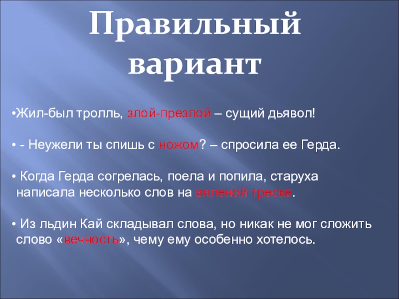 Из льдин Кай складывал слова, но никак не мог сложить слово «вечность», чему ему особенно хотелось.