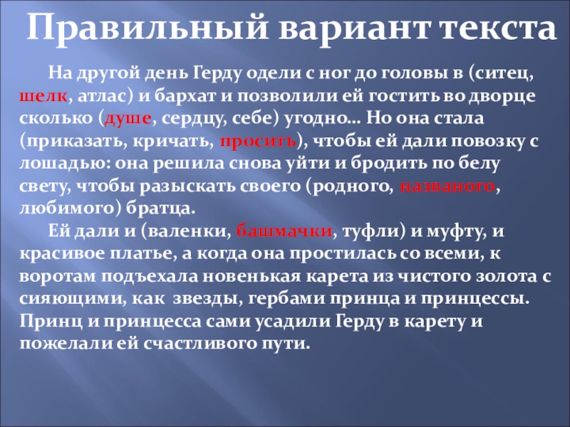 в (ситец, шелк, атлас) и бархат и позволили ей гостить во дворце сколько (душе, сердцу, себе) угодно… Но она стала (приказать, кричать, просить), чтобы ей дали повозку с лошадью: она решила снова уйти и бродить по белу свету, чтобы разыскать своего (родного, названого, любимого) братца.
