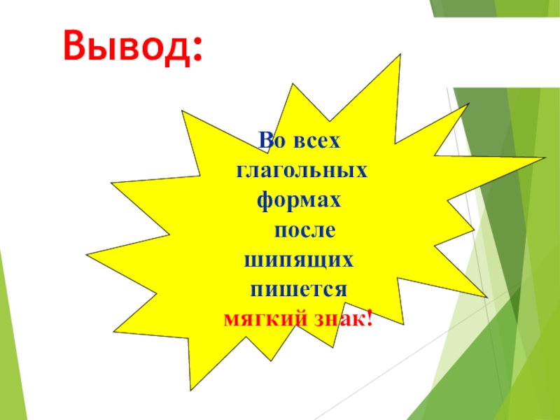 Вывод:Во всех глагольных формах после шипящихпишется мягкий знак!