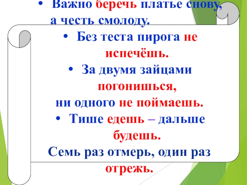 ?Важно беречь платье снову,   а честь смолоду.Без теста пирога не испечёшь. За двумя зайцами погонишься,